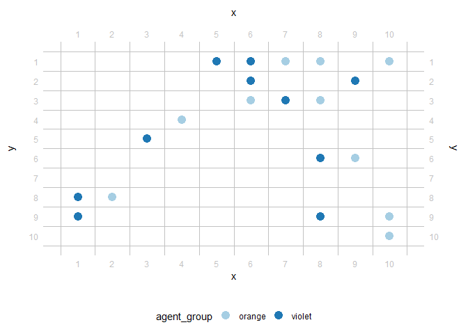 #> agent_groupNow let’s add those agents to our environment. We want several orange and several violet ones. In fact, we’d like ten each. By default, they are thereby randomly distributed across our grid environment.